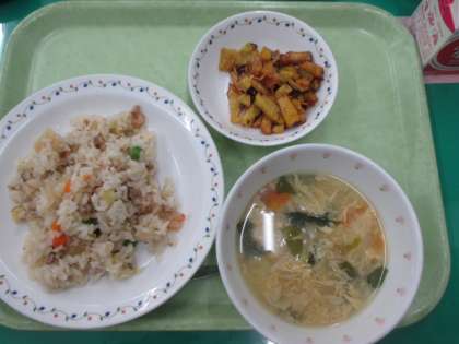 チャーハン・キャラメルポテト・たまごとわかめのスープ・牛乳