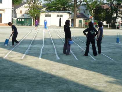 放課後、先生たちが全員で、運動会に備えて校庭のライン引きを行いました。前日までにサッカーのコーチたちがサッカーゴールを移動してくれたおかげで、1時間くらいで写真のようなラインを引くことができました。いよいよ3週間に迫ってきました。
