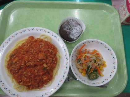 スパゲティミートソース・じゃこいりサラダ・ガトーショコラ・牛乳