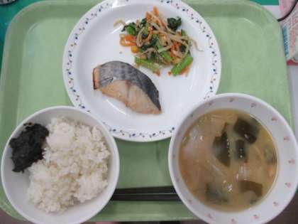 ごはん・さわらのしおこうじやき・ごまあえ・みそしる・海苔の佃煮・牛乳