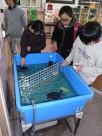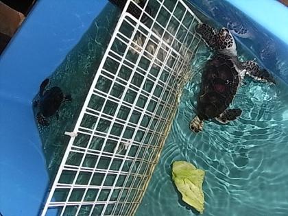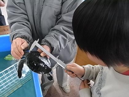 木曜日は、よくカメの測定をします。今日もその日でした。カメボラの子どもたちが主事さんの協力で、カメの甲羅の長さや体重を測定しました。甲羅の長さは、大きいほうが15センチ、小さい方が13センチに、体重も600グラムと500グラムになっていました。体重だけ初めの頃と比較すると、なんと、12倍に増えていました。食欲も旺盛で、元気そのものです。カメボラの子どもたちも、えさを決まった量を上げたり、水槽の掃除をしたり、記録ノートに記入したり、お世話を一生懸命してくれています。