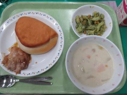 テリヤキバーガー・コーンクリームスープ・青のりポテトビーンズ・牛乳