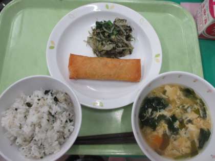 わかめとじゃこのごはん・彩野菜のはるまき・のりあえ・かきたま汁・牛乳