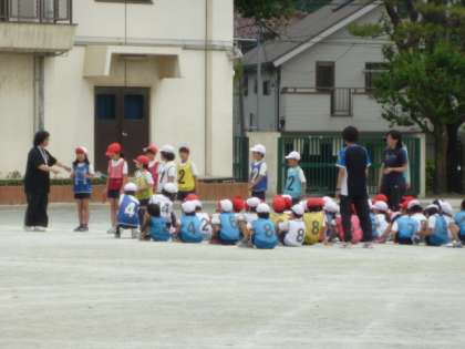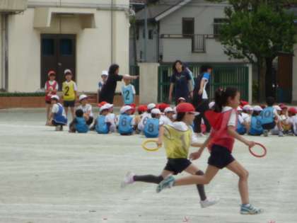 給食時間の前に、低学年リレーの練習が行われています。リレーの選手たちは、みんなの声援にこたえるように、一生懸命バトンを落とさないようにしながら走り込んでいます。