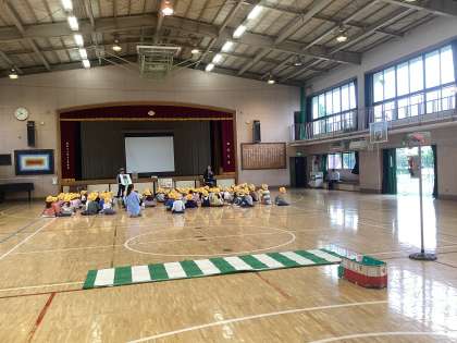 体育館に信号機と横断歩道が出現し、正しい横断の仕方を学びました。青信号がチカチカしたら渡らない・・・今日も元気に「ただいま」が言えるように。