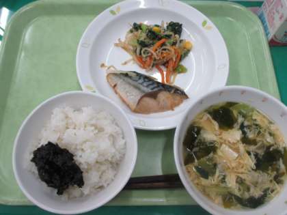 ごはん・さばの韓国風焼き・ごまあえ・かきたま汁・手作りのりの佃煮・牛乳