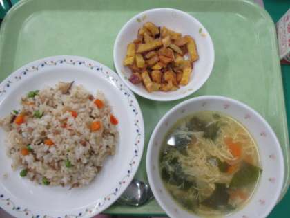 チャーハン・キャラメルポテト・たまごとわかめのスープ・牛乳