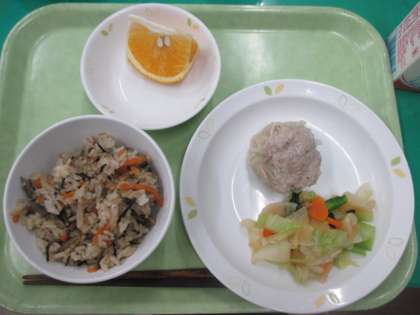 五目ごはん・じゃんぼシュウマイ・野菜のあえもの・あまなつ・牛乳