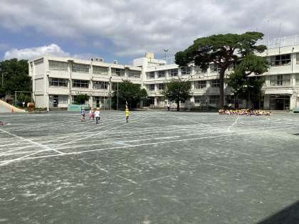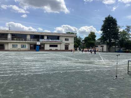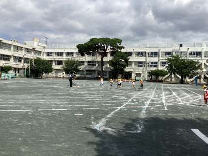 1年生のプログラム「かけっこ」の練習風景です。黄色い帽子が脱げるくらい一生懸命に走ります。