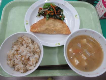 じゃこごはん・じゃんぼぎょうざ・のりあえ・みそしる・牛乳