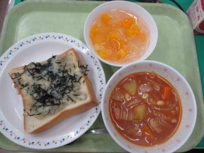 じゃこマヨトースト・ロシアンシチュー・フルーツ寒天・牛乳