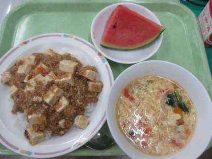 マーボー豆腐どん・たまごとトマトのとろみスープ・すいか・牛乳