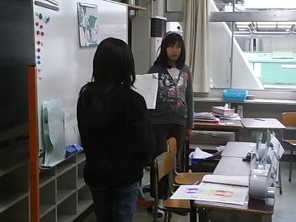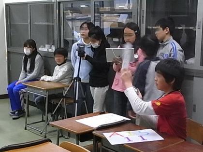 放課後、教室を回ってみると、算数ルームで、5年生の社会科の勉強の続きとして、5年1組でニュース番組を制作していました。カメラマン、ディレクター、アナウンサーそれぞれを自分たちで役割分担して演じていました。一瞬、スタジオに来ているみたいでした。