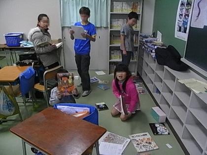 5年1組の図書係が、放課後、学級文庫の本のチェックと本の整理をしているところです。PTAの方々に各学級の本のリストを作っていただいたので、それを基に本のチェックをしています。係として放課後の時間を使って、一生懸命でも楽しそうに活動していました。