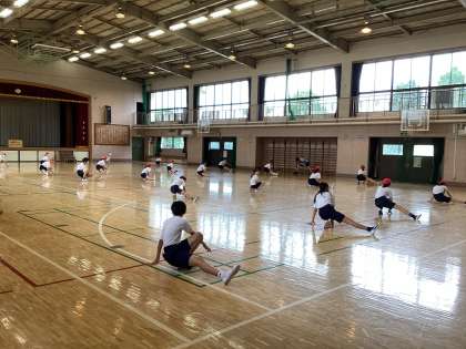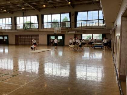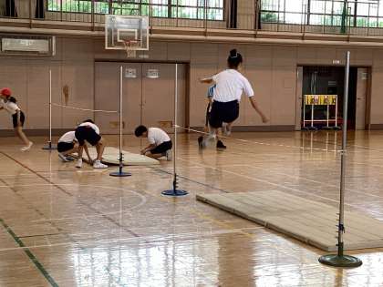 準備体操をしっかりと行ったあとは、みんなで協力しながら走り高跳びの準備をします。テキパキとした行動で体育館の空気も引き締まります。