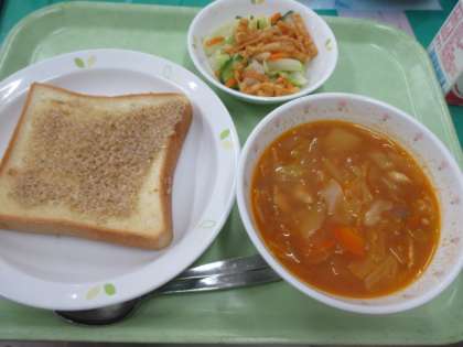 セサミトースト・トマトのスープ・カリカリまめサラダ・牛乳