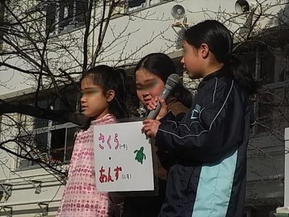 今日の全校朝会の場で、カメボラの代表の人たちから、みんなに募集していたアオウミガメの名前の発表がありました。2匹のカメは女の子であることがわかったので、女の子らしい名前として、「さくら」と「あんず」という名前に決定したそうです。いろいろな名前があったそうですが、カメボラのみんなで相談した結果、このように決まりました。どちらが「さくら」で、どちらが「あんず」なのか、見分けがなかなかつきにくいのですが、大きいほうが「あんず」、小さい方が「さくら」と覚えるといいかもしれません。