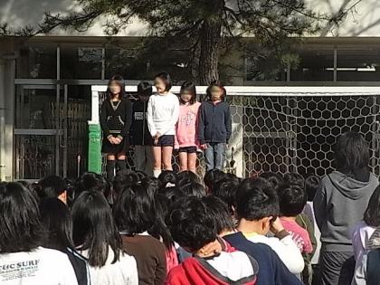 本年度最後の全校朝会の場で、5年生の5人が「6年生になるにあたって」「ピアノの練習」「バレーのこと」などを話してくれました。どの子も自分の考えを端的に上手に話してくれました。