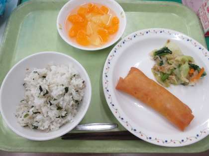 わかめとじゃこのごはん・彩野菜の春巻き・きゃべつのあっさりあえ・