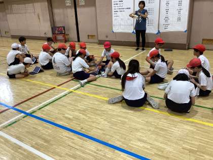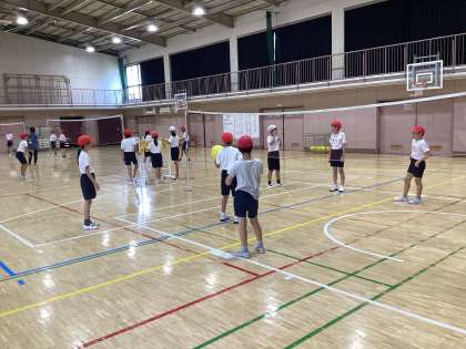 ミニソフトバレーボールの学習です。落とさないようにどの子も一生懸命です。