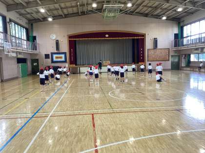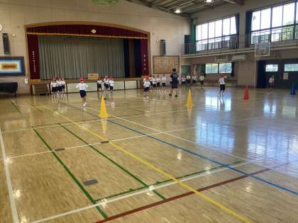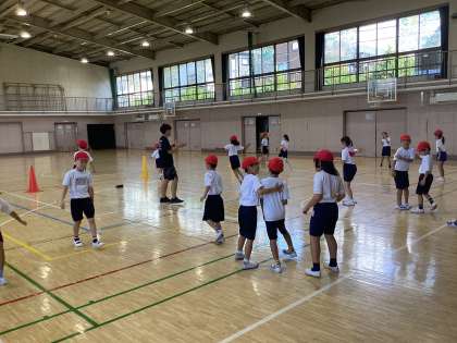 走・跳の運動です。リズムに合わせて色々な跳びかたに挑戦しています。