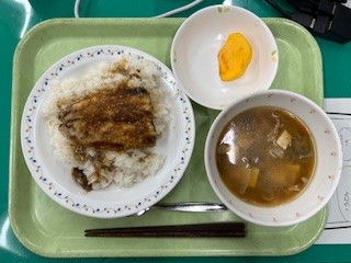 イワシのかば焼き丼・豚汁・柿・牛乳