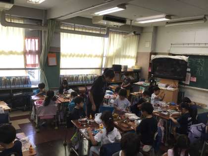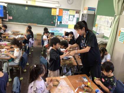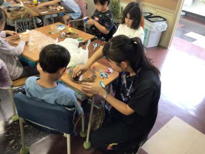 松ぼっくりやリボン、大きめのビーズなどを使ってリース作りをしました。お友だちと材料を交換したり、きれいだね!と声をかけたり・・・すてきなリースが出来上がっていきました。