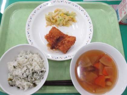 わかめとじゃこのごはん・イカフライ・はくさいのピリピリづけ・五目汁・牛乳