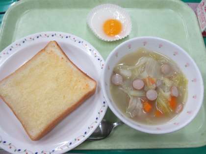 ガーリックトースト・ポトフ・おかしなめだまやき・牛乳