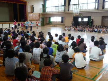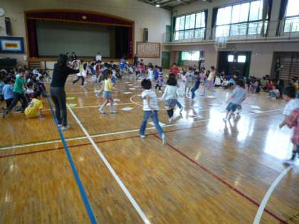 3,4時間目に、2年生と4年生との玉小タイムが、体育館で行われていました。4年生の子どもたちがリーダーとなって、はじめの会の司会進行をやっていました。2年生は、4年生のお兄さん、お姉さんの話をしっかり聞いて、動いていました。はじめの会の後、「猛獣狩りに行こうよ!」や「大型カルタとり大会」などのゲームを楽しんでいました。4年生のリーダーシップが発揮されて、和やかな会になっていました。100人近くの保護者の皆さんの参観もありました。