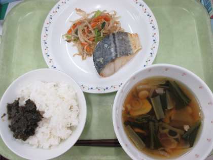 有機米ごはん・さわらのしおこうじやき・ごまあえ・五目汁・牛乳