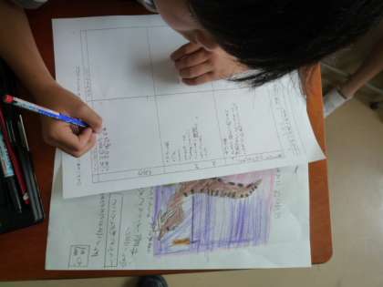 1時間目に3年1組の教室で、「米と麦」の学習後の発展学習場面を見学しました。子どもたちは、米と麦のように、2つのものを取り上げて比較して表にまとめる勉強をしました。「猫と犬」「キリンとリス」など、自分の関心のある2つのものを調べて、その違いを調べる学習に進んでいました。
