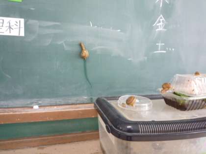 そんな時、静かに勉強している時に、子どもたちから笑い声が聞こえてきました。ふと振り返ると、後ろの黒板を写真のように教室で飼育しているカタツムリが脱走していました。