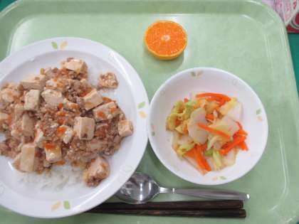 マーボー豆腐丼・白菜のピリピリづけ・みかん・牛乳