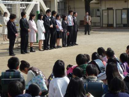 満開の桜の咲き賑わっている校庭で、始業式が行なわれました。それに先立って新3年生と新5年生のクラス編成の発表もありました。子どもたちは、登校中も元気いっぱい挨拶していましたが、始業式の間も担任発表まで、何か落ち着かない状態でした。担任発表が終わって教室でそれぞれ担任からの話を聞いてようやく落ち着いてきたようでした。今日からそれぞれが進級し、新しい学年で、学級の先生と1年間学習と生活をともにしながら成長していきます。子どもたちの成長の様子を是非楽しみながら見守ってください。又、学校へのご理解とご支援のほど、よろしくお願いいたします。