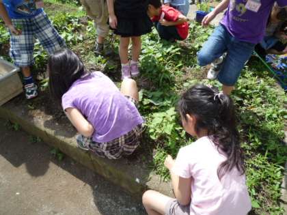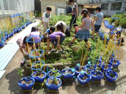 1年1組が、プール前の学年園の草取りをしていました。「どんな野菜を育てているのかな?」と聞くと、「出来てからのお楽しみ」という返事が返ってきました。両手にいっぱい摘みとった雑草をもって、雑草抜きをがんばっていました。たのしみですね。