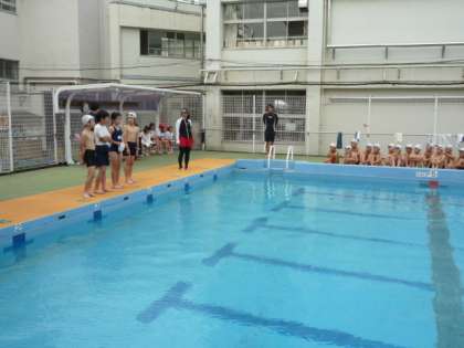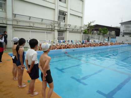 なかなか天候に恵まれなかった4年生は、やっと今日プール開きができました。各学級の代表の人が今年のプールの目標を発表し、準備運動、バディ、水慣れの順でプールに入りました。4年生は、からだがグンとたくましくなる年齢です。なるべく学校のプールや夏休みのプールは休まないで、泳力とともに体力も付けてほしいと思います。