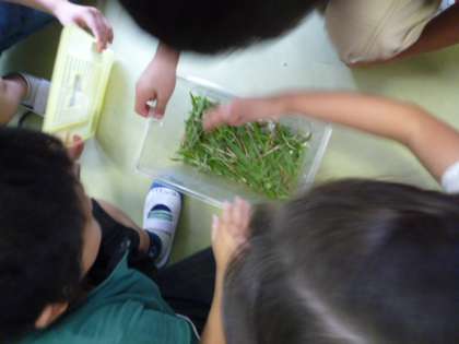 2年生は、今日の午前中、多摩川まで歩いて行って、夏をさがしてきました。たくさんの子どもたちが、汗をいっぱいかきながら、教室や廊下で「校長先生、バッタがたくさんいたよ。こんなに取ってきたよ。」と興奮気味に話しかけてきました。暑い中でしたが、子どもたちは元気いっぱいでした。