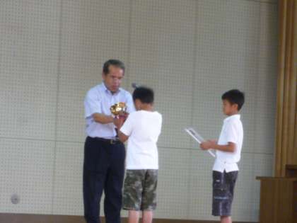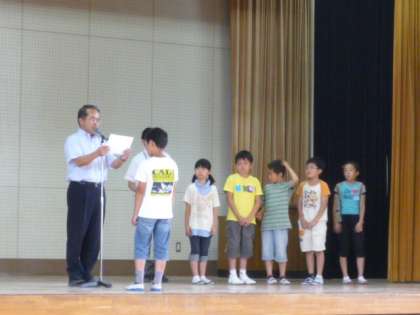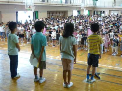 長いようで短かった76日間の1学期の終業式が体育館で行われました。校長先生から、この1学期にそれぞれの学年ががんばっていたこと取り組んでいたことについてお褒めの言葉がありました。そのあと、玉川スポーツ少年団のサッカー部の4年生が、東京都大会で参加校の中で1校だけ、「フェアプレー賞」を受賞したので、全校に紹介しました。とても名誉なことでした。そのあと、恒例になった1学期給食完食大賞を発表しました。喫食回数67回中67回とも完食した第1位は、4年4組、6年1組。第2位は66回の2年2組、3年1組。第3位は65回の5年1組、5年4組という結果でした。全体的に給食を残さず食べるようになってきているうれしい結果になりました。
