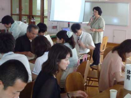 強い雨の降る午後2時から、中町小のランチルームで「なかたまの学び舎」の玉川小、中町小、玉川中の先生たちが一堂に会して、5月に実施した学習確認調査の結果の報告会と今後の対策についての話し合いの時間をもちながら研修を深めていきました。3校とも世田谷区の平均を超えていることが分かったのですが、子どもたちの思考力、判断力、表現力をつけていくためにどうしたらよいかということが、3校の課題として残り、今後各校で授業改善をしていくことと、2,3学期お互いの授業を見あっていくという話になりました。先生方の交流も深まり、和やかな雰囲気で終了することができました。
