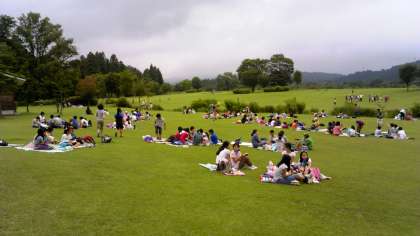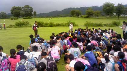 昼食場所の大谷川公園に着きました。天気は曇り。誰一人車酔いする子もなく、行動班に分かれてきれいな芝生の上で、楽しそうに食事していました。