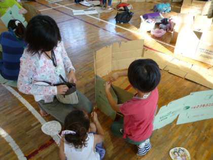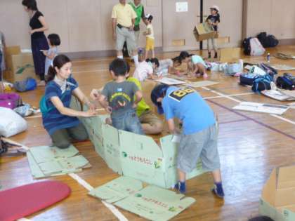 おやじの会と学校協議会の共催で、玉小サマーキャンプが1泊2日で行われます。午後4時から開会式を校庭で行いました。80人の参加児童を8つのグループに分けて、各グループの班長をおやじの会のメンバーがやってくれています。おやじの会会長から「夏休みの中の2日間、楽しい思い出を作ってください。」というあいさつがありました。そのあと、体育館に行って段ボールでの寝床作りを行いました。