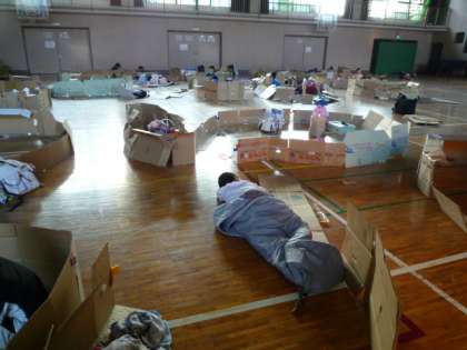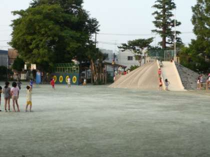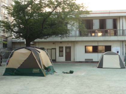 朝5時過ぎの校庭の様子。子どもたちは、早朝から元気に校庭で遊び始めています。校庭に張られているテントの風景が、サマーキャンプを象徴しています。体育館では、まだ寝ている子も何人かいました。