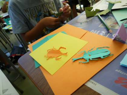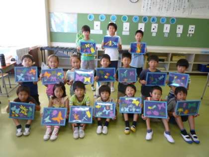 第2音楽室では、画家で本校の保護者である関先生に毎年恒例の「紙切りで昆虫を作ろう」の講座をお願いしました。カブトムシやクワガタムシ、チョウなどの絵を図鑑から写し取って、切り取る作業に精を出しました。低学年はハサミの使い方がまだまだ器用でないため、いくら絵をきれいに書いてもきりとりが難しくて、往生しました。完成した作品と一緒に記念撮影をしました。子どもたちが第2音楽室の机といすをしっかり後片付けをしてくれてうれしかったです。関先生ありがとうございました。