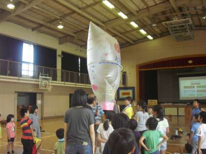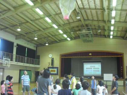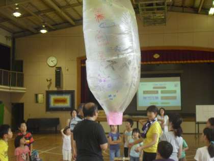 今年、おやじの会の知り合いの関係で、何とJAXAの宇宙教室をカルチャースクールの中で実施できました。「熱気球を作ろう」に、30名の参加者と保護者の方が集まって、体育館で熱気球を飛ばしました。とても盛り上がって、参加した子どもたちは大喜びでした。
