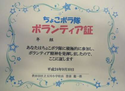 今年の4つの町会が行った子ども祭りに、玉小ちょこボラお祭り隊として、一生懸命、お祭りのお手伝いをしてくれた3年生から6年生の25人の子どもたちに、「ボランティア証」として表彰しました。代表の6年生が、ちょこボラ隊をやっての感想をしっかり発表してくれました。町会の方や地域の方から、「よくお手伝いをしていましたよ。」とたくさん褒められ、学校と地域をつなぐキューピット役になってくれました。