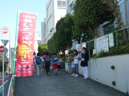 西門でもあいさつキャンペーンをやっています。PTAの役員の皆さんと先生方、そして、代表委員会の子どもたちです。子どもたちのあいさつの声の大きさが、昨日よりもちょっと大きくなったような気がします。大きな声で気持ちのいいあいさつをしましょう。