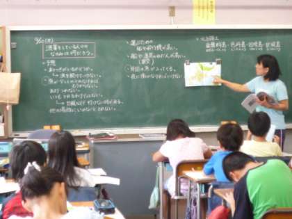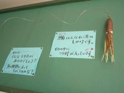 5年3組の中山先生の社会科の授業を参観しました。教室に入って目についたのは、教室の後ろの壁に貼り付けられた、マグロを採るための仕掛けでした。先生がわざわざ築地市場まで行って買ってきた貴重な教材です。今日のねらいは、漁業を営む人々の悩みについて考える授業でした。とても面白い授業になりました。
