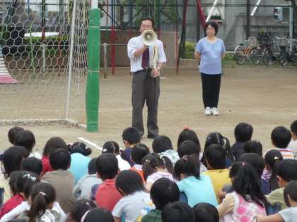 今年度2回目の避難訓練で、不審者対応の訓練でした。1年生ははじめての訓練でしたが、私語が少なく立派でした。4月の時よりも早く集合ができました。避難訓練は毎月実施し、火事や地震などを想定した訓練も行なわれています。