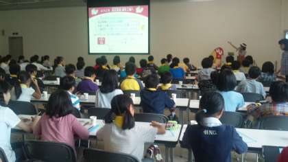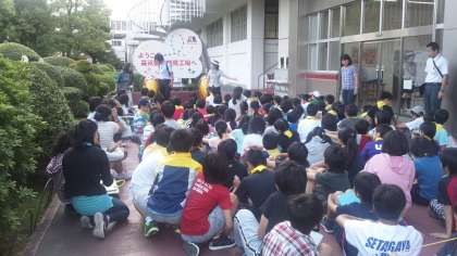 森永製菓鶴見工場に着きました。ホールでアイスココアをいただき、説明を聞きました。